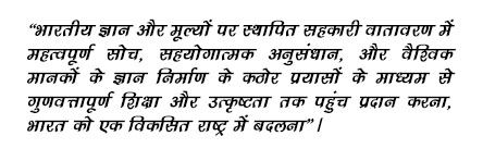 "To provide access to quality education and excellence through rigorous efforts of critical thinking, collaborative research, and knowledge creation of global standards in a cooperative ambiance founded on Indian wisdom and values, transforming India into a developed nation".