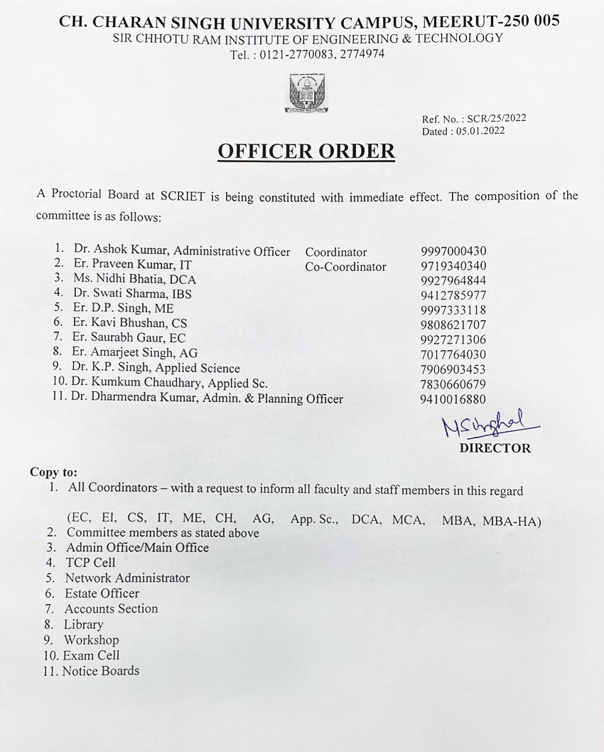 University has strong Proctorial Board comprising of the faculty members from various departments and from SCRIET. It looks after the conduct and discipline of students in the campus. If the student is found guilty of any type of misconduct, breach of discipline, causing harassment to any one belonging the University or causing destruction of University property, a strict disciplinary action will be taken against him as per provisions decided by the university authorities.