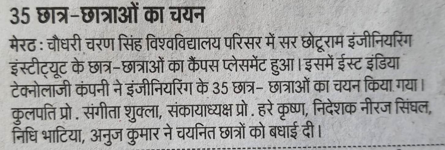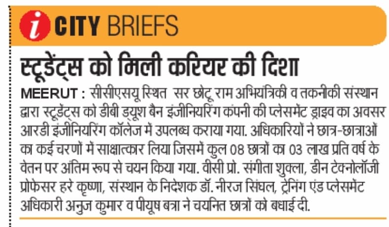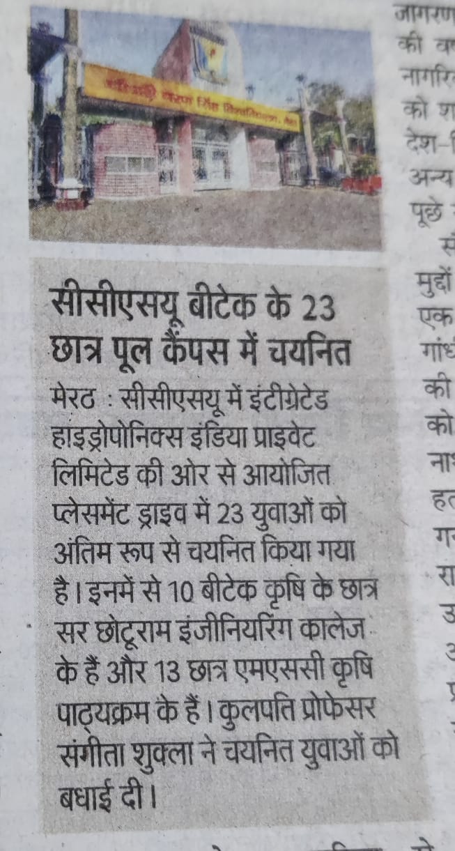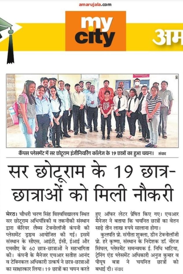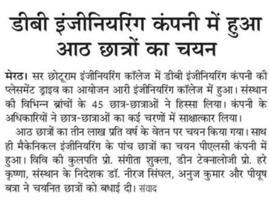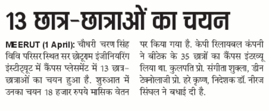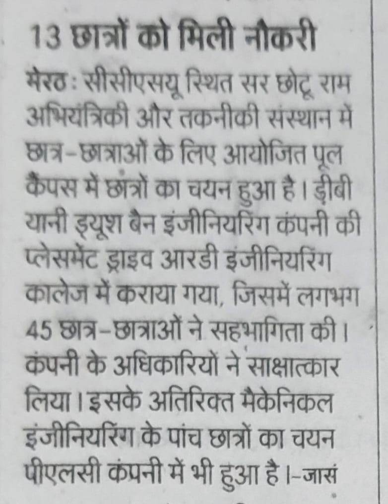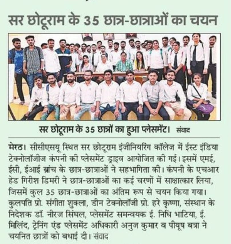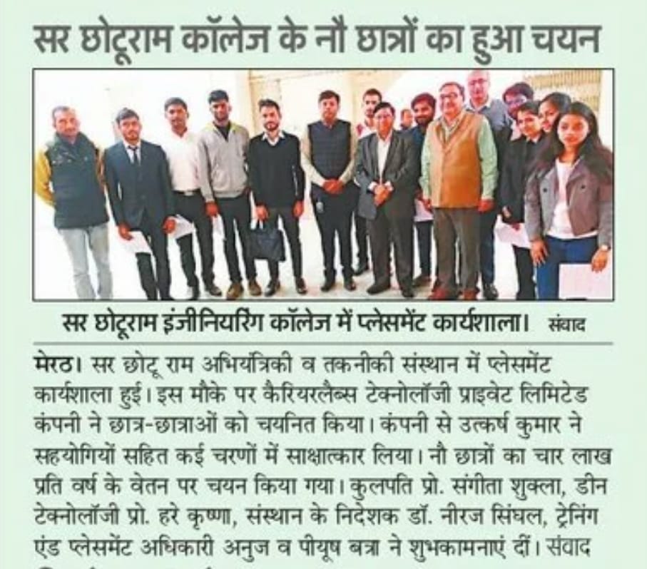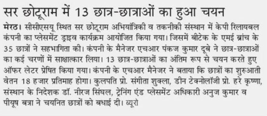 The Training cum Placement Cell, SCRIET facilitates the process of placement of students passing out from the Institute besides collaborating with leading organizations and institutes in setting up of internship and training program of students. The Placement Cell liaises with various industrial establishments, corporate houses etc which conduct campus interviews of students from all disciplines. The Training cum Placement Cell provides the infra-structural facilities to conduct group discussions, tests and interviews besides catering to other logistics. The Placement Cell interacts with many industries in the country, of which many companies visit the campus for holding campus interviews. The industries which approach the institute come under the purview of: Core Engineering industries IT & IT enabled services Manufacturing Industries Consultancy Firm.